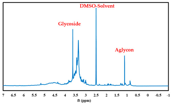 The PS green surfactant is analyzed by 1H NMR, as illustrated in Figure 10. The oligosaccharide component of saponin, which is represented in this figure at 2.8–4.9 ppm, is placed on the left side of the graph, while the aglycon component of the PS green surfactant, which is shown at 0.7–1.2 ppm, is positioned on the right side of the figure. The 1H NMR evaluation results of the PS green surfactant match remarkably with the previous findings [26,30,31].