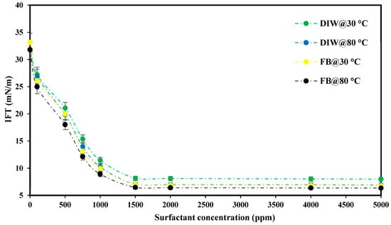 The CMC measurement in this study was performed using two conventional tests, including IFT and contact angle measurements. Figure 11 indicates the IFT of crude oil and PS green surfactant prepared in DIW and FB at 30 and 80 °C. This figure shows that the IFT value declined quickly from its initial state to 1500 ppm. Raising the surfactant concentration to 5000 ppm had little influence on the IFT value independent of solution type and temperature. Therefore, the CMC point of the PS green surfactant is 1500 ppm.