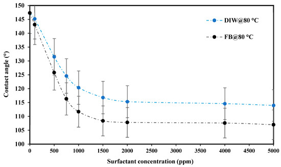 Ultimate contact angle reduction by the addition of 1500 ppm of PS green surfactant in various concentrations of FB at 80 °C.