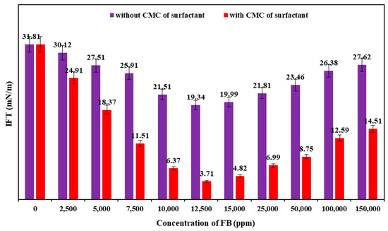 IFT results of various concentrations of FB and crude oil with and without the CMC value of PS green surfactant at 80 °C.