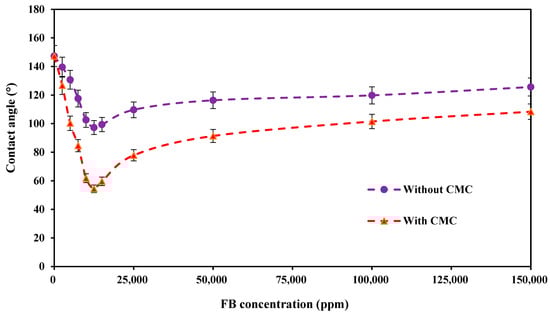 Contact angle values of crude oil and carbonate rock with and without CMC of PS green surfactant at various concentrations of FB at 80 °C.