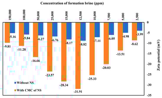 Zeta potential measurements of various solutions of FB with and without natural surfactant (NS) at the CMC point (1500 ppm) at 80 °C.