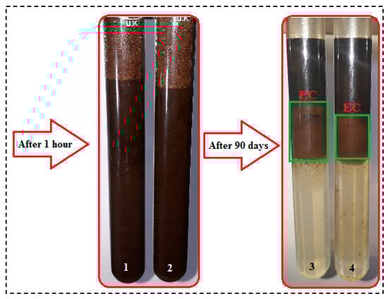 The ability of the PS surfactant for emulsification was examined using static bottle tests at 80 °C. Two solutions containing 1500 ppm of PS green surfactant were prepared: the first with 12,500 ppm of FB (representing optimum salinity) and the other with 150,000 ppm of FB. Figure 17 presents the images of the two solutions after 1 h and 90 days. As depicted in this figure, pictures 1 and 2 represent the emulsion after one hour of mixing, where a single phase was produced. After 90 days, however, three different phases are identified: the oil, the emulsion, and the water columns, from top to bottom (images 3 and 4). After 90 days, the PS green surfactant successfully created an emulsion phase between the crude oil and water phases. The emulsion column height (labeled “EC”) for the solution with 1500 ppm of green surfactant and 12,500 ppm of FB (marked as 3) is higher than the emulsion column height for the solution with 1500 ppm of green surfactant and 150,000 ppm of FB (marked as 4).
