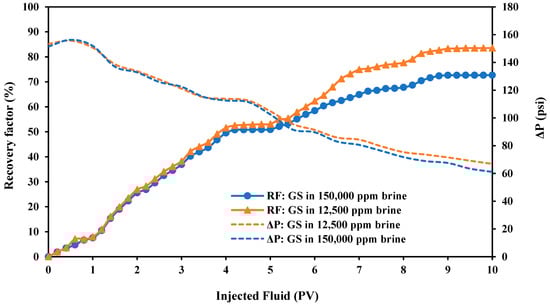 Oil recovery factor and pressure drop measurements with two solutions containing the CMC value of PS green surfactant (GS) as the tertiary recovery at 80 °C.