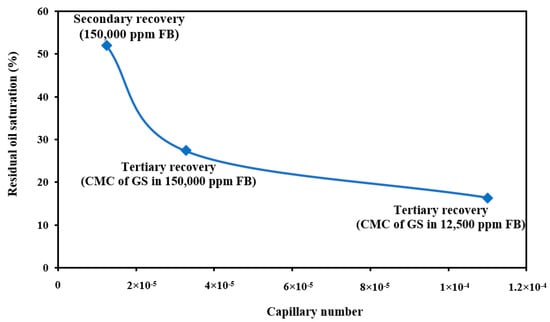 As shown in Figure 19, the capillary number was at its lowest value during the secondary recovery (1.25 × 10−5), and the residual oil saturation was about 52%. Then, applying surfactant flooding as the tertiary recovery positively impacted improvements to the capillary number, where the capillary number increased significantly. The tertiary recovery with a solution of 1500 ppm of PS green surfactant and 150,000 ppm of FB resulted in a capillary number of 3.27 × 10−5 with a residual oil saturation of 27%. For the best case, where 1500 ppm of PS green surfactant was prepared in 12,500 ppm of FB, the capillary number was increased to 1.10 × 10−4 with a residual oil saturation of 16%. The capillary number values showed that applying PS green surfactant and the optimum concentration of FB (12,500 ppm) was very effective in improving the oil recovery and reducing the residual oil saturation. The findings of capillary numbers in this experiment are consistent with data from the literature [55,56].