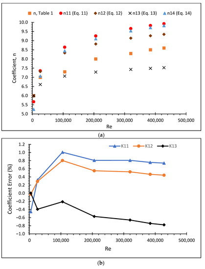 Errors in the K shape coefficient were obtained using the n coefficient determined from Table 1. The shape coefficients of K11, K12, K13, and K14 were calculated using the n coefficient calculated from Equations (11)–(14) are listed in Table 2, respectively. According to Table 1, the Reynolds number changed from 4000 to 428,000.