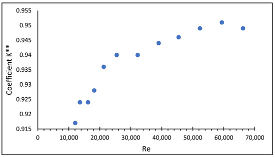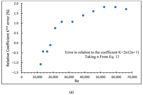 Figure 6 illustrates how the Reynolds number affects the K** coefficient, whereas Figure 7a shows the relative error of the K** coefficient based on the value of the K coefficient when Equation (13) was utilized to derive the n coefficient values. Figure 7b displays the error of the K** coefficient in relation to the fixed value of the coefficient K = 0.933, which was employed by the manufacturer of the device.
