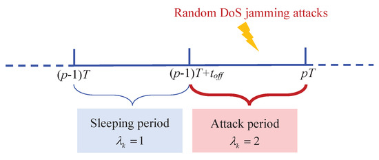 Within the ()th ( is an integer) period, instead of launching attacks constantly, the adversary first restores energy without action, and then initiates an efficient random DoS attack. That is, the ()th period is divided into the sleeping period () and the attack period ().