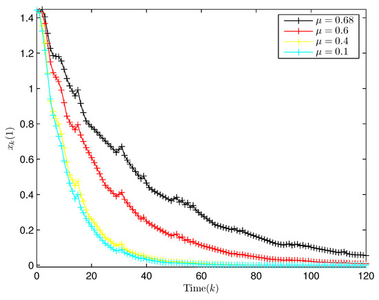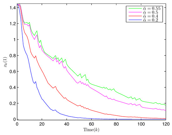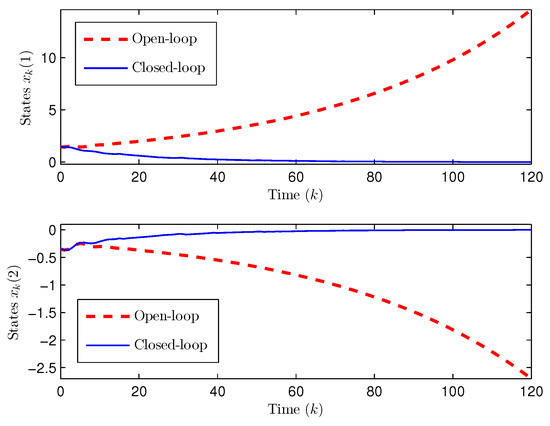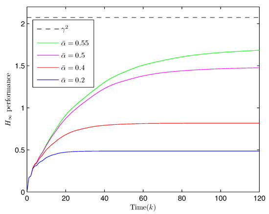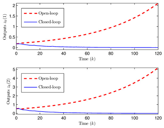 The disturbance is represented as . The initial states of system (1) are specified as an array of random numbers chosen from a standard normal distribution. The initial states of the observer (5) are set as . The duration of one period is supposed as , the time of replenishing energy is given as , and the total operating time is , namely . The curves obtained through the simulation are shown in Figure 3, Figure 4, Figure 5, Figure 6, Figure 7, Figure 8, Figure 9, Figure 10 and Figure 11. Figure 3 plots the closed-loop control output with the control input and the open-loop output without the control input, respectively. In Figure 3, is the th element of . The open-loop and closed-loop state trajectories are drawn in Figure 4, where shows the 𝚥th element of . In Figure 5, states of system (1) and the observer (5) are plotted, respectively, in which indicates the ℑth element of . The performance is presented in Figure 6, which illustrates that the influence is rejected below index from the external disturbance on the control output. An event-triggering situation is shown in Figure 7. The occurrence situation of periodic random DoS jamming attacks is seen in Figure 8, where means that a DoS attack appears. State and performances are shown in Figure 9 and Figure 10, respectively, under different occurrence probabilities of attack. It is seen that the exponential mean-square stability and the performance are always satisfied using the developed control method in this paper. It also indicates from Figure 9 and Figure 10 that the bigger the occurrence probability of attack, the slower the convergence rate, and the worse the performance. State under different values of thresholds for event-triggering frequency is shown in Figure 11, which exhibits that the bigger the value of , the more difficult it is to realize event triggering (the longer the convergence time). Thus, the simulation results indicate that the designed PID control method is effective and reliable.