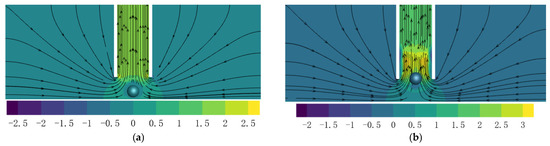 Figure 11 shows the vortex structure around the particles at different times of the suction process. In Figure 11b, we can observe that the wake flow before the particle entering the pipe is obvious, which agrees with the results of Chen’s analysis [37], in that the wake is the reason that the vertical force of the particles oscillates around the mean value in Figure 7.