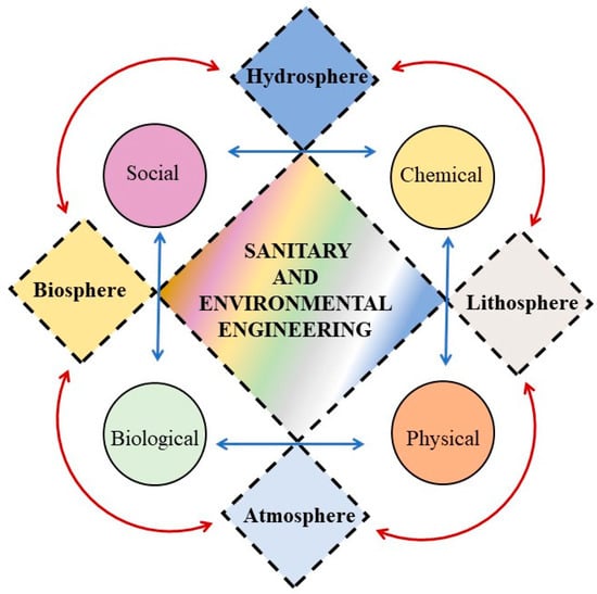 The environment consists of living and inanimate elements that mutually interact and affect each other’s health and lifespan. Anthropogenic sources of pollution are of particular concern as they are increasing exponentially, constituting a rate faster than ever before in the Earth’s history. A 2016 report reported that 24% of global deaths are due to changing environmental factors []. In addition, since 1970, the average wildlife population size decreased by 69% []. These phenomena show that health and environmental sciences are key factors in terms of responding to the changing environment in order to live healthily, in coexistence, and in prosperity. Major concerns regarding health and the environment are at the heart of the Sustainable Development Goals of the United Nations Educational, Scientific, and Cultural Organization [], which are a collection of interconnected goals intended to serve as a common blueprint for global peace and prosperity for the current period and in the future []. In addition, the sustainable development goals are directly or indirectly related to sanitation and environmental technology. For example, the goals of no poverty and no hunger can greatly improve public health, facilitate improved well-being, and promote healthy lifestyles at all ages, and ensuring clean water and sanitation can improve water security and facilitate access to sanitation. In addition, the realization of sustainable cities and communities can make our settlements safe, resilient, and sustainable. Responsible consumption and production will reduce pressure on the environment, reduce food waste and chemical use, and increase recycling. Climate action will strengthen the resilience of communities and increase adaptive capacity and responses to climate-related disasters. Ecosystem conservation will protect organisms from degradation and biodiversity loss. Finally, international cooperation will strengthen the implementation of these goals through the exchange of knowledge, expertise, and experience between nations. More than ever before, humanity is being called upon to take action to protect the environment and public health. The environment in which we live is the most important factor of our health and well-being. Human activities have a significant impact on the atmosphere, lithosphere, hydrosphere, biosphere, and even outer space. Biological, chemical, physical, and social risk factors are components of our daily lives, and scientific research is constantly challenged to understand and mitigate these interactions to make life on Earth more sustainable (Figure 1). The sustainability of human societies and the biodiversity that supports them requires the responsible management of natural resources, including the development of technologies and regulations.
