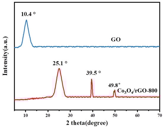 X-ray diffraction (XRD, Panalytical Empyrean) was used to determine the composition of the catalyst. One sharp peak at 2θ = 10.4° attributed to the (001) crystal plane was observed at the XRD pattern of GO (Figure 2) []. For Co3O4/rGO-800, the peak at 2θ = 10.4° disappeared, and there were three peaks at 2θ = 25.1°, 39.5°, and 49.8°, corresponding to the (002) facet of stacked graphene sheets [], the (222) and (331) crystal faces of the cobalt oxide (Co3O4) nanoparticles, respectively (JCPS No. 76-1802) []. These results were in accordance with the SEM results and elemental mapping results. In conclusion, the characterization analysis results demonstrated that cobalt oxide was successfully loaded onto rGO.