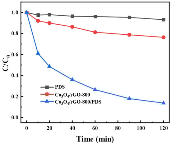 The catalytic activity of Co3O4/rGO-800 was evaluated (Figure 3). Clearly, CTC could not be efficiently removed with PDS alone and Co3O4/rGO-800 alone. Without Co3O4/rGO-800, only 6.8% of CTC was removed after 120 min, suggesting that CTC could not be efficiently degraded with unactivated PDS, and a catalyst was needed to catalytic reaction []. Additionally, the addition of Co3O4/rGO-800 only removed 23.6% CTC within 120 min. This demonstrated that adsorption was involved in CTC removal process but it was not the predominant mechanism []. Meanwhile, CTC degradation efficiency reached 86.3% within 120 min in the Co3O4/rGO-800/PDS system. These results clearly demonstrated that CTC removal was mainly driven by the catalytic degradation, and Co3O4/rGO-800 was a promising PDS catalyst. The enhanced CTC degradation in the Co3O4/rGO-800/PDS system might be attributed to the improved physiochemical characteristics after Co loading []. In addition, Co species could also play as active sites for PDS activation to generate powerful reactive oxygen species (ROS) [].