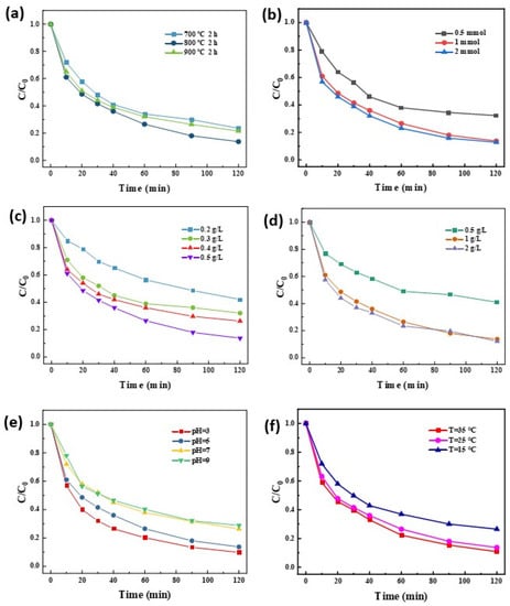 Temperature was also considered as an important factor. The effect of solution temperature (T = 15 °C, 25 °C and 35 °C) on CTC degradation was studied. As revealed in Figure 4f, the optimal degradation effect was achieved when the solution temperature was 35 °C, reaching 89.2% in 120 min. With the solution temperature gradually decreased from 35 °C to 15 °C, the degradation rate also decreased from 89.2% to 73.5%, which demonstrated that the system had a good degradation effect on CTC under a wide range of temperatures. The temperature accelerated the movement of molecules and the contact between the catalyst and PDS was more frequent, which promoted the faster generation of free radicals and the corresponding increase in the degradation rate of CTC [].