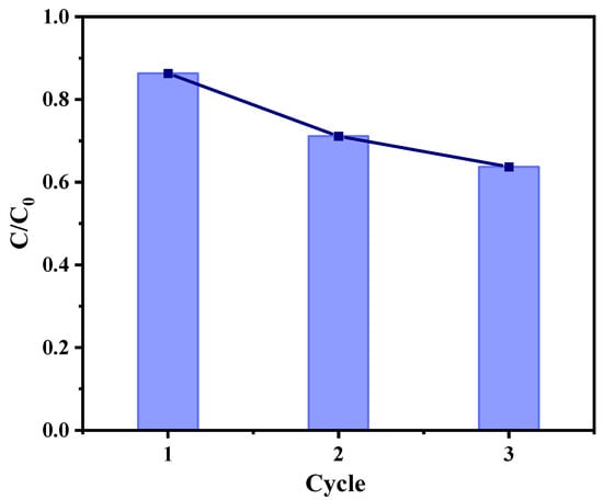 The durability and reusability of the Co3O4/rGO-800 catalyst were significant indicators to be considered in practical applications. Recyclable materials will considerably reduce disposal costs and lower costs []. As displayed in Figure 5, the degradation rates of CTC reached 86.3%, 71.1%, and 63.7% in the first, second, and third cycle tests, respectively. The decrease in degradation rate in the second and third cycles was presumed because the active sites of the material were worn out or consumed during the previous experiments and part of the structure was destroyed, which led to the decrease in catalytic effect []. However, the removal rate in the third cycle was still higher than the related previous paper. For example, Su et al. developed graphene oxide-carbon nanotubes anchored α-FeOOH hybrid catalyst (α-FeOOH@GCA) as a persulfate activator for the degradation of Orange II. The degradation rate obtained in the first run in the α-FeOOH@GCA/persulfate system was 99.1%, and the rate then decreased to 38.4% in the third cycle []. Pedrosa et al. prepared metal-free graphene-based catalytic membrane for persulfate activation to degrade phenol, they found that the degradation rate decreased from 94% to 27% after three cyclic experiments []. Olmez-Hanci et al. reported the degradation of Bisphenol A by reduced graphene oxide (rGO)/persulfate system. In the first run, Bisphenol A can be completely removed within 10 min. Additionally, the degradation rate gradually decreased to 68%, 33%, and 35% in the second, third, and fourth cycles after 30 min reaction, respectively []. Jiang et al. developed graphene-like carbon sheet supported nanoscale zero-valent iron (nZVI@CS) as a persulfate catalyst for the degradation of atrazine. The removal ratio of atrazine in the nZVI@CS/persulfate system was 84.27% in the first run, and then, it decreased to 82.0%, 63.1%, and 14.2% in the second, third, and fourth cycles, respectively []. Therefore, the as-synthesized Co3O4/rGO-800 catalyst was superior or comparable to the previous related papers. Additionally, it exhibited good stability and reusability in cyclic experiments. In fact, the decline in the catalyze reactivity of the carbon-based catalyst in sulfate radicals-based AOPs is very common, and it was extensively reported. Leaching of metal species, consumption of active sites, and the destruction of structure might all contribute to the decreased catalytic reactivity []. To further increase the stability of the catalyst, great efforts should be dedicated in future research.