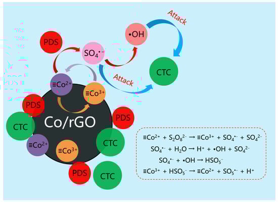 To ensure food safety, control water contamination and the proliferation of drug-resistant bacteria, various approaches were proposed to eliminate CTC [,]. Advanced oxidation processes (AOPs) use the powerful oxidative free radicals (such as •OH) to oxidize and even mineralize pollutants, it is considered as an efficient and insightful remediation technique []. Recently, sulfate radicals-based AOPs caused rising interests owing to the advantages of high performance and wide operation pH range []. Sulfate radicals (SO4•−) could be generated through activating peroxymonosulfate (PMS) and peroxydisulfate (PDS) using different activation strategies, such as UV irradiation, heat, ultrasound, alkaline, and transition metals []. Transition metals activation is widely deemed as a promising approach since it is simple, low cost, and high performance []. Cobalt (Co) is the most efficient PDS catalyst compared with other transition metals, and cobalt ion (Co2+) was frequently reported as an effective PDS activator for organic pollutants degradation []. However, the application of homogeneous Co2+ would lead to the discharge of Co2+. Co2+ is highly toxic and carcinogenic, and the remaining Co2+ in the aquatic solution are likely to have negative effects on human health [].