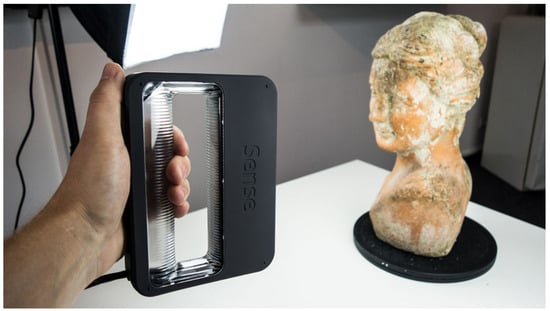 On the other hand, the issue of obtaining accurate 3D data from real-world objects, especially when they are more complex than simple geometric shapes such as spheres or cubes, is a major challenge. The problem has been difficult to solve in the past and approaches have been time consuming. The development of powerful computing systems and digital measuring devices has resulted in an ever-evolving market for 3D scanners. These systems allow the capture of geometric and color information carried by objects within a minimum time frame. The principles guiding their operation are based on the geometric axioms and functions that will be discussed in more detail below. This ability is of paramount importance in cases where a customized component needs to be fabricated, because the exact topological features of the installation site can be acquired swiftly. A 3D scanner can be defined as any device capable of automatically collecting 3D coordinates from a given area on the surface of an object [,,]. This method is usually performed at high speed, with hundreds or even thousands of sample points collected per second. This allows a real-time scanning process that can also distinguish between different colors and textures. The mode of use of such a device may be fixed in a particular location, on a classic, photography tripod or on a similar type of transportable base. One of the main reasons why 3D scanners are growing in popularity is because of the tremendous improvement in computer hardware for creating real-time 3D graphics. The ability to efficiently handle complex 3D geometries on low-cost platforms is useful for visualizing detailed and accurate 3D models generated by scanning devices []. The goal of all studies is to minimize the time required to capture objects while maintaining high fidelity of results. Figure 2 depicts a handheld 3D scanner.