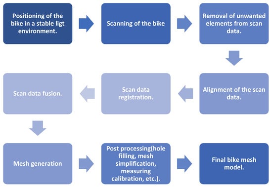 The 3D Scanner that was used to capture the physical geometry of the bicycle was the model “Eva” from the company Artec 3D®. The scan data helped to visualize the finished part of the tail rack on the bike, as well as provide a starting point for precise measurements to be taken. Having an accurate scan model ensures that the rack mounts are placed exactly where they should be. Taking that into a close consideration, the scanner “Eva” using the technique of constructed light and two offset cameras is able to achieve accuracy up to 0.1 mm (0.1 mm is the distance between the points of the point cloud, the smaller distance implies greater mesh quality) and capture texture quality up to 1.3 MP (megapixel). Figure 3 depicts the proposed 3D scanning process flowchart.