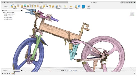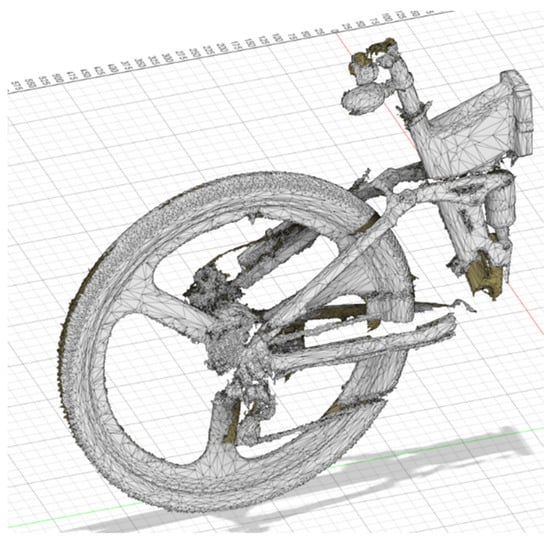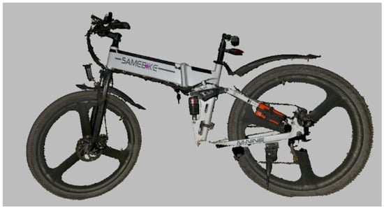 The initial 3D scan results obtained from the 3D scanning procedure of the e-bike’s frame also included feature texture (color), and were processed in the dedicated 3D scanner’s Artec Design Studio® v.17 software. Figure 5 depicts the digitized version of the physical e-bike.