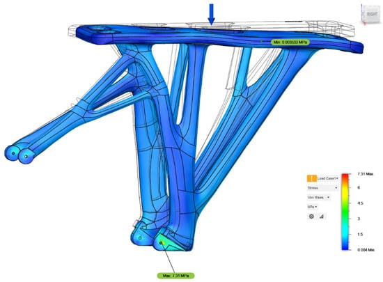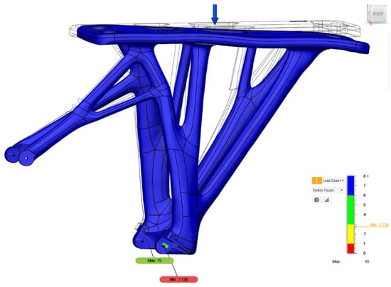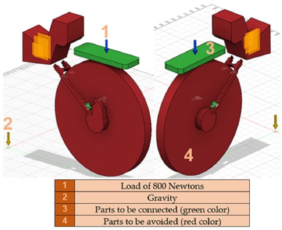 The generative design and simulation processes were carried out in Fusion 360® software. Highlighted with green color are the areas that the software will try to connect with the most optimal path using criteria such as mechanical strength, weight, manufacturing methods, and material of the generated part. Indicated with red color are the areas that the part will have to avoid, taking into close consideration clearances for the wheel and other obstacles such as the disk brakes. Last but not least, visible with yellow and blue arrows are the gravity force and the bike rack load force, respectively, as shown in Figure 9. The load that was applied in this simulation was 800 Newtons that implies approximately 800 N of load.