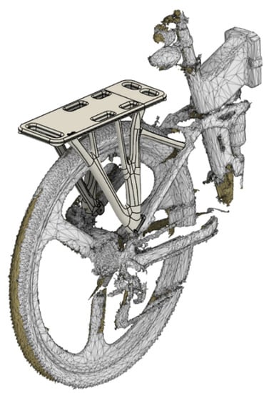 For fit and finishing purposes, the final product was digitally placed on the e-bike scanned model to ensure the compatibility as well as the accuracy of the rack mount. In this way, potential design mistakes can be swiftly detected. Another advantage of this technique is that it aids in the visualization of the real life product fit, as depicted in Figure 12.