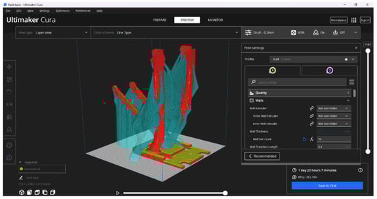In this context, the test/prototype part was 3D printed using a Raise3d Pro2 Plus® FFF 3D printer. The material used was Innofil® ABS Fusion by BASF®. The processing parameters used in the 3D printing operation were the ones dictated by the manufacturer of the material (250 °C for the hot end temperature and 90 °C for the heated platform), while the speed was set at 60 mm/s and the retractable top lid was installed. To achieve optimal layer adhesion, the orientation of the print played a major role in obtaining good mechanical properties. With that in mind, the part’s geometry was designed to be printed vertically, in order to withstand the mechanical forces of the relevant application. Thus, all angles of the model were designed to be above 65 degrees in that orientation, enhancing printability, requiring less support material, and making it easier to print overall. For the slicing process, Ultimaker Cura slicing software was selected. Figure 15 shows a screenshot of the slicing process with the 3D model virtually placed in the 3D printer’s building volume, while Figure 16 shows the actual 3D printing process.