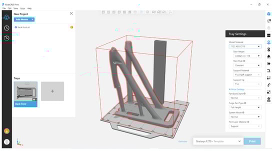 As far as the end-product is concerned, a Stratasys® F270 FDM 3D Printer with heated chamber was used. The material used was ABS CF10 by Stratasys®. The processing parameters used in the 3D printing operation were the ones dictated by the manufacturer of the material (in this case the dedicated slicing software does not allow the user to select). For the slicing process, the dedicated GrabCad Print® slicing software from Stratasys® was used. Figure 17 shows a screenshot of the slicing process with the 3D model virtually placed in the 3D printer’s building volume.