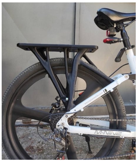 Upon the completion of the fabrication process, both the prototype and the final peripheral component end-product were sequentially installed on the e-bike’s frame. In both cases, the fit proved to be flawless and the process can be characterized as successful. At this point, it is important to mention that the dimensional tolerance of the scan data was cross-referenced with the measurements of a caliper at critical points such as the width of the fork and the positions of the holes, among others. The use of the 3D scanner was crucial because it helped speed up the measuring process of the 3D dimensional part. The same work could be accomplished with the use of a caliper and laser inclinometer, but there would be more room for human error while changing the position of the measuring tool. Moreover, the rear end of the bike would have to be disassembled for the measuring tools to fit correctly. Figure 18 shows the installed component that now serves as end-product on the e-bike.