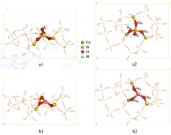 A periodic film of hydroxylated amorphous silica was employed, as depicted in Figure 1. The structures were taken from prior works, which were based on amorphous SiO2 (111) surface and were obtained by moving the thin layer position in the (111) direction. The details of their structural characterization are published in these works [26,27]. Furthermore, Wang et al. [28] conducted a comprehensive study of the geometries of silica rings in SBA−15 and identified six-membered and six-membered rings as the principal structural components. The Si atom, which is substituted by the Cu atom, was surrounded by six-membered and five-membered rings and was attached by one hydroxyl. The unit cell dimensions are 12.8 × 17.0 × 23.7 Å3. The total number of atoms is 94 (CuSi17O49H27).