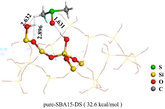 Figure 2 depicts the most stable adsorption structure and the associated adsorption energy of the interaction between DMSO and the pure SBA−15 surface. To simplify the description, the notation “pure-SBA15-DS” is employed to denote the most stable adsorption structure of DMSO on the pure SBA−15 surface. As shown in Figure 2, DMSO mainly interacts with the surface of the molecular sieve via its O or H atoms, and the adsorption energy is 32.6 kcal/mol. The oxygen atom of DMSO forms a hydrogen bond with the hydrogen atom in the hydroxyl group connected to the silicon atoms within the five-membered and six-membered rings, and the distance between the oxygen and hydrogen atoms measures 1.631 Å. Furthermore, the hydrogen atoms within the DMSO molecule are attracted by the nearby twin silanol [30] and bridging oxygen atoms, with atomic separations of 2.632 Å and 2.896 Å, respectively.