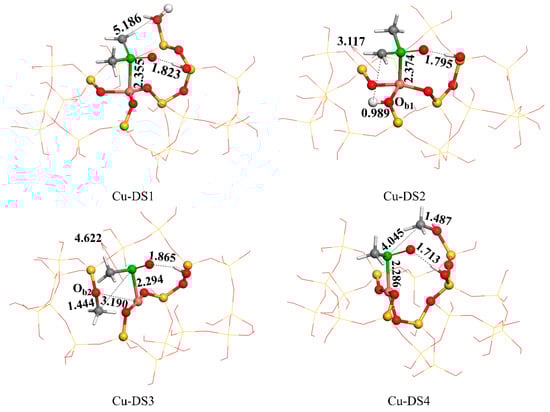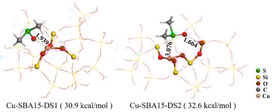 According to the study by Lu et al. [31], the node of the Si−O five-membered ring and six-membered ring in SBA−15 is the most active site. They studied the complex reaction mechanism of ethanol to 1,3-butadiene by doping Zr atoms at this site [31]. In this work, the Si atom has been replaced on the pure SBA−15 surface at this site with Cu atoms, thus constructing a Cu−doped SBA−15 molecular sieve surface. The introduction of Cu atoms has resulted in an increase in the number of Lewis acid sites on the surface. By investigating the various orientations and adsorption sites of DMSO molecules on the Cu−doped SBA−15 surface, the adsorption structures of DMSO on this surface were obtained. Figure 3 illustrates the representative adsorption structures of DMSO on the Cu−doped SBA−15 surface. For the sake of brevity, “Cu-SBA15-DS” was used to refer to the adsorption structure throughout the following exposition.