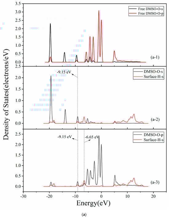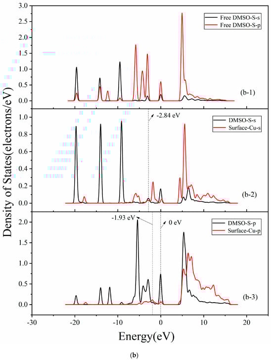 The PDOS of the most stable configurations for DMSO on the pure (a) and Cu−doped SBA−15 (b) surfaces before and after adsorption: (a-1) represents the O s- and p-PDOS before DMSO adsorption, (a-2) represents the O s-PDOS and H s-PDOS and (a-3) represents the O p-PDOS and H s-PDOS after DMSO adsorption. (b-1) represents the S s- and p-PDOS before DMSO adsorption, (b-2) represents the S s-PDOS and Cu s-PDOS and (b-3) represents the S p-PDOS and Cu p-PDOS after DMSO adsorption.