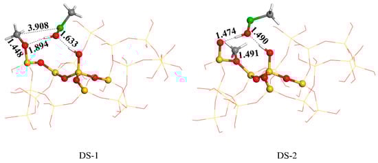 In this section, the catalytic cracking process of DMSO on the pure SBA−15 surface was investigated, using the most stable adsorption structure of DMSO on the pure SBA−15 surface (i.e., pure-SBA15-DS in Figure 2) as the reactant. DMSO comprises three types of chemical bonds, namely, C−H, C−O, and C=S bonds. In view of the fact that the bond energy of double bonds is greater than that of single bonds, the focus is primarily on the breaking of C−H and C−S bonds. Structural optimization reveals that the optimization process of C−H bond breaking yielded no dissociation product. Moreover, research has shown [32] that the bond energy of C−H and C−S bonds is 96–99 kcal/mol and 66 kcal/mol, respectively, signifying that C−S bonds are more prone to cleavage than C−H bonds. As a consequence, the breaking mechanism of C−S bonds in DMSO molecules on the pure SBA−15 surface has been examined in greater detail, and Figure 5 displays the dissociation structure of DMSO on the pure SBA−15 surface in which C−S bonds are broken. For the sake of convenience, the term “DS” is employed to designate the dissociation structure.
