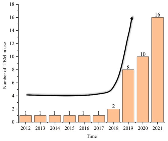 TBMs were first introduced to coal mine roadway boring applications in 1999 at Wangjialing coal mine [7]. In recent years, the DZ028 hard rock roadheader manufactured by China Railway Construction Heavy Industry Group was used for the first time to dig 5800 m in 2014 in the Xinjiang Flooded Bay coal mine subleveling project, which took 1160 calendar days and reached a maximum daily advance of 18 m. In 2015, a hand-jaw roadheader was developed by China North Heavy Industry Group Co. It was the first production line of TBM boring, with an optimal daily advance rate of 30.7 m and an average daily advance rate of 13.5 m. In 2016, Shenhua Shendong Tenglianta Coal Mine (China) started construction of its No. 2 auxiliary shaft with a TBM that is capable of crossing hard, soft, and mixed ground. The project produced the best monthly advance rate of 639 m, with an average monthly advance rate of 500 m for four consecutive months. In the last decade, the use of TBMs in coal mines has gradually grown, with more than 10 TBMs already in use in coal production after 19 years. Figure 1 shows the statistics of the number of TBMs used in coal mines in recent years [8].