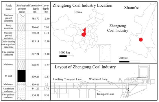 The Zhengtong Coal Industry is mainly mining the Yan’an Group 4 coal seam, buried at a depth of 1000–1100 m. The coal seam histogram and geographical location of the mine are shown in Figure 2. The mine is a high gas mine, and the coal seam is a spontaneous combustion coal seam; and, the coal dust is at high risk of explosion. The mine’s geological conditions are also complex, with deep water, high ground pressure, high temperature, high gas, high pressurized water, soft rock, and other natural disasters.