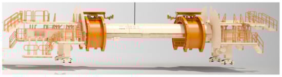 By connecting the cutter plate directly to the reloading belt, the original host belt is omitted and a series of main drive systems such as the main motor, external shield, and other auxiliary structural components are designed to be located around the main beam so that the original four sections of the main beam are shortened to two sections of the main beam (Figure 5), which significantly shortens the length of the host and eliminates the touch bottom skid, connecting bridge and mixed spray system in the post-support system. The structure and equipment in the post-support system, such as the bottoming sheave, connecting bridge, mixed spray system, etc., which are not suitable for mine tunneling, have been eliminated. This modification allows the length of the first TBM used in the original Zhengtong Coal Industry to be reduced from 167 m to 75 m for the third TBM and the turning radius to be shortened from 500 m to 90 m, which improves the flexibility of the equipment and enhances the adaptability of tunneling in the complex tunnel system of the mine; shortens the construction time and installation time of the assembly and installation chambers, reducing the preparation period for tunneling; shortens the empty roof distance, ensuring the on-site support and improving the space of the equipment. This shortens the construction time and installation time, reduces the preparation time, and shortens the distance to the top of the roof, ensures the safety of the construction, and ensures efficient and continuous TBM tunneling.