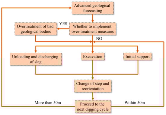 (2) Adverse geological conditions forecasting and treatment to avoid water conduction by fault fissures during excavation In other words, it is divided into two parts, namely, over-prediction and comprehensive management. In terms of advance forecast, it is mainly conducted through the macro forecast of bad geology, long-term and short-term advance geological forecast of the bad geological body of the cave, advance drilling, and proximity warning of construction geological hazards. In the aspect of comprehensive management, it is mainly based on the above forecasting and the implementation of different treatment plans and treatment measures for the nature and types of adverse geological bodies and possible construction geological hazards.
