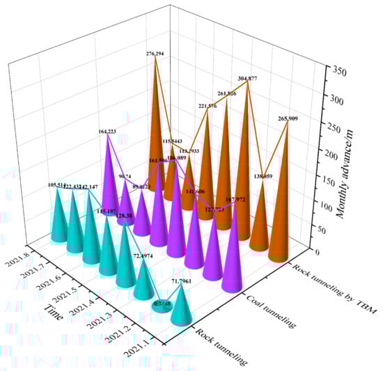 After the application of the TBM tunneling equipment intelligent tunneling system, the project completed the development of the auxiliary transport lane in the west area of the Zhengtong Coal Industry as scheduled. As shown in Figure 10, during the practical application of the test tunneling period from January to August 2021, the average monthly progress using TBM construction reached 272.9 m, the maximum monthly advance was up to 305 m, and the daily progress could reach more than 10 m. The construction efficiency was twice as high as that of the comprehensive tunneling of the rock lane and seven times as high as that of the general tunneling of the rock lane (all rock tunneling in the mine was done by TBM in February), making the tunneling efficiency of the lane greatly improved. It can effectively alleviate the problem of succession tension in the Zhengtong Coal Industry. After that, the mine continued to promote the application of TBM equipment to the smooth introduction of lightweight TBM tunneling equipment for 403 surface drainage tunneling; the current application of the footage effect is remarkable, promoting the improvement of the economic and technical benefits of the Zhengtong Coal Industry, and provided a new idea for mines with similar conditions to solve the problem of mining succession. Furthermore, its successful practical experience provides a sufficient reference basis for changing the current mine construction concept, giving full play to the advantages of TBMs, guaranteeing mine mining succession, and driving the transformation and upgrading of the traditional mining industry.