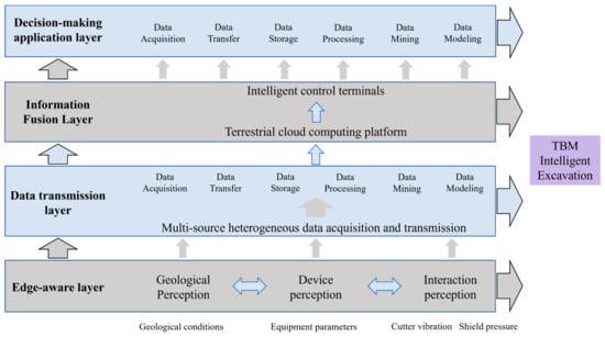 TBM tunneling is already fully automated, and with the adaptation of complex geology, the conditions for intelligent and unmanned tunneling are available. The research on intelligent TBM tunneling should follow the principle of “perception as the basis, information fusion as the center, and intelligent tunneling as the goal”, and establish the overall research system of TBM intelligence (Figure 12), which includes: edge perception layer to improve the equipment’s ability to detect and warn of adverse geological information in front of the roadway tunneling work. The data transmission layer aggregates different types of data, transmits them to the platform layer, and stores them in a classified manner to ensure the real-time integrity of each type of data for later data mining and analysis; (1) the platform fusion layer is used for deep mining and fusion of the acquired multi-source information for big data analysis, knowledge base, and rule base; (2) the decision application layer is used for the establishment of the TBM intelligent system (Figure 11); (3) the platform fusion layer is used to deeply mine and fuse the acquired multi-source information for big data analysis, knowledge base and rule base establishment; (4) the decision application layer gives TBM intelligent assisted driving suggestions based on the developed expert knowledge base, virtual tunneling experiment platform, tunneling parameter estimation model, and intelligent guidance model [31].