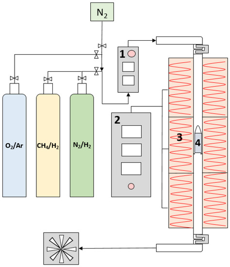 The R41 reactor scheme for the synthesis of catalysts (1—gas flow regulator, 2—temperature regulator, 3—furnace (3 zones), 4—quartz glass cuvette with sample).