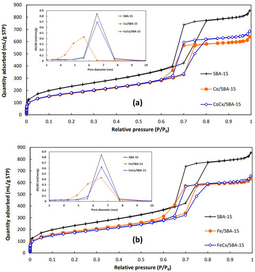 The adsorption–desorption isotherms of the fresh cobalt- and iron-based catalysts are shown in Figure 3a,b. The nitrogen adsorption isotherms of the catalysts (with and without carbide phase) exhibited a type IV isotherm, with a H2 hysteresis loop for the SBA-15 supported catalysts. A defining characteristic of the isotherm observed for these materials is the presence of a hysteresis loop, which is related to capillary condensation taking place within the mesopores, resulting in limited uptake over a range of high P/P0. The first portion of the type IV isotherm is attributed to monolayer to multilayer adsorption. Type IV isotherms are commonly observed for many mesoporous materials. The observed H2 hysteresis loop is attributed to the complex pore structure of the materials, which is characterized by ink-bottle-shaped pores with poor connectivity and an uneven pore structure [22,23]. The BJH technique was employed to determine the pore size of the catalysts. The pore sizes of both Co- and Fe-based catalysts (with and without carbide phase) were observed to be in the mesoporous range of 3–10 nm. Similar to the pore volume, the pore size of the catalysts slightly decreased after loading 5% cobalt or iron on SBA-15, which could be due to partial pore blockage. However, after carbidation of these Co/SBA-15 and Fe/SBA-15 catalysts, the pore sizes were almost similar to those of fresh SBA-15. These findings confirm that carbidation of the catalysts and formation of CoCx or FeCx on the surface resulted in a slight increase in the BET surface area, pore size, and pore volume of the catalysts.