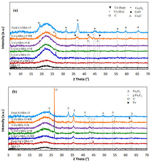 The fresh and used cobalt- and iron-based catalysts were characterized to identify the cobalt- and iron-based phases in these catalysts (Figure 4a,b). The strong and broad peak at 2theta 15–30° is attributed to the amorphous structure of the SBA-15 [24,25]. Peaks belonging to the cubic phase Co3O4 (PDF card no. 65-3103) at 2theta of 19°, 31.4°, 37°, 45°, 55.9°, 59.5°, and 65.4° were observed in the fresh Co/SBA-15 catalyst. After using this catalyst in the FT reaction without reduction, the catalyst exposed to syngas for 6 h (U-Co/SBA-15-WR) showed new peaks belonging to cobalt with a hexagonal closed-packed (hcp) structure (PDF card no. 00-005-0727) at 47.5°, and a face-centered cubic structure (fcc) of cobalt (PDF card no. 00-001-1259) at 44.4°, resulting from the reduction of the catalyst by exposing it to H2 + CO during the reaction.