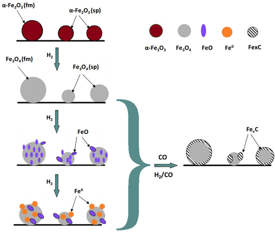 Cobalt carbides are known as an active site for FT reaction, and iron oxides transform into iron carbides during the reaction. In the presence of hydrogen, the fresh iron catalyst undergoes reduction in both bulk and surface regions, resulting in the formation of Fe3O4 from the ferromagnetic (fm) and superparamagnetic (sp) structures of α-Fe2O3 (hematite) [26] (Figure 5). As reduction continues, Fe3O4 is converted to wüstite (FeO) and ultimately to metallic Fe (α-Fe). At temperatures above 200 °C in an inert atmosphere or at temperatures above 150 °C in a H2-containing atmosphere, the disproportionation of FeO can occur kinetically [27]. Metallic iron is the primary active phase in Fe-based catalysts, and its transformation into iron carbides that can significantly affect the catalyst activity and product selectivity during the FT reaction. χ-Fe5C2 (Hägg carbide) is recognized as a highly active phase for the production of long-chain hydrocarbons, while FeO can act as an active phase for the water–gas shift reaction.