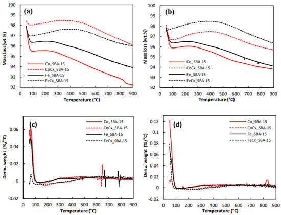 The aim of this method was to determine whether the formation of a carbide phase is possible in these catalysts and in what percentage. Thus, based on a long thermogravimetric analysis of all samples, it can be concluded that the formation of the carbide phase occurs with approximately the same percentage content of about 2.6 wt.% for both Co/SBA-15 and Fe/SBA-15 catalysts.