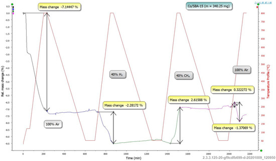 Long−term thermogravimetric analysis of Co/SBA−15 catalyst with four heating ramps temperature profile.
