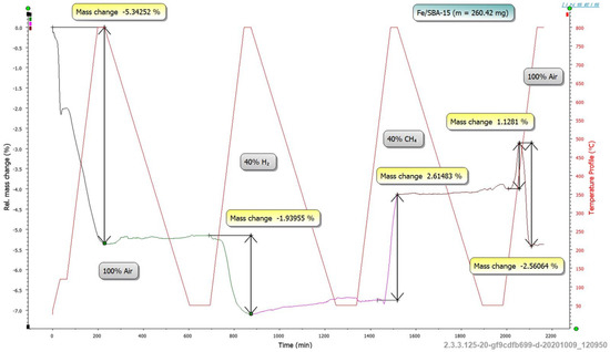 Long−term thermogravimetric analysis of Fe/SBA−15 catalyst with four heating ramps temperature profile.