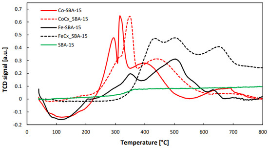 In the case of iron catalysts Fe/SBA-15 and FeCx/SBA-15, the reduction occurred in three steps starting from 300 °C to 700 °C. However, as seen from the graph, the carbide sample had a higher hydrogen consumption, which could be due to a stronger metal-carbide interaction. Negative values of the TCD detector signal were observed in non-carbide samples, which could be due to the low content of metals in the catalysts, hindering their detection.