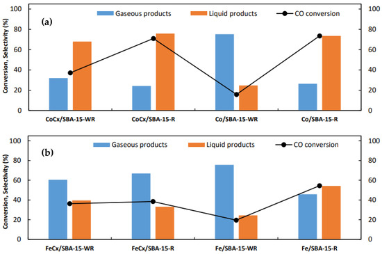 The catalytic performance of the prepared cobalt- and iron-based catalysts was evaluated in an autoclave reactor, and the results are discussed in this section. The catalytic activity of catalysts, with and without reduction with hydrogen, was studied (Figure 10). For comparison, the catalytic performances of metal oxide catalysts (Co/SBA-15 and Fe/SBA-15) were also evaluated at the same reaction conditions with and without reduction with hydrogen. The non-reduced Co-SBA-15 catalyst did not show high activity, and the products were mainly in gaseous form. Reducing the catalyst with hydrogen resulted in the formation of Co0 as the catalyst’s active sites, and the catalyst’s activity increased sharply, and CO conversion increased from about 16% to 73%, while the products were mainly heavier hydrocarbons in the liquid phase (73%). The CoCx/SBA-15 catalyst without reduction (CoCx/SBA-15-WR) showed better results than Co/SBA-15-WR. The CO conversion was 37%, with 68% selectivity to the products in the liquid phase. During the FT reaction, in the presence of syngas, the cobalt carbide could be decomposed to carbon and Co0 (the active site for FT reaction) [31,32,33], resulting in a higher activity of the catalyst.