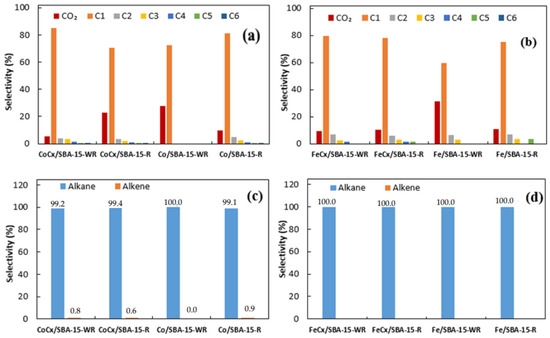 Cobalt-based catalysts predominantly exhibit activity in their metallic state, whereas in the case of iron-based catalysts, reports have shown that iron oxides, iron carbides, and even metallic iron can act as active sites [26,41,42,43]. In this study, as shown in Figure 10b, the catalytic activity of FeCx/SBA-15-WR (36%) was slightly lower than that of FeCx/SBA-15-R (38%). The main product of the reaction over these two catalysts was gaseous products, mainly alkanes, with the highest selectivity to methane (Figure 11b,d). The hexagonal close-packed ε-carbide Fe2C could be developed in small particles, while the χ-carbide Fe5C2 could be developed in larger particles. The catalytic activity depends on the carbide phase and its content. Several theoretical analysis characterizations have reported that the Hägg χ-Fe5C2 is the main active phase of the iron-based FT catalysts [44,45]. During the reduction of the carbide catalyst with hydrogen, the remaining oxide form of iron was reduced, which, in the presence of syngas, converted to iron carbides. Therefore, the activity increased slightly after the reduction of this catalyst.