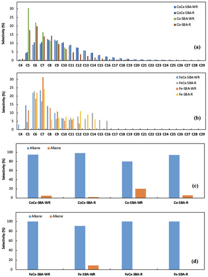 Liquid product analysis in the FT reaction over (a) cobalt-based catalysts, (b) iron-based catalysts, (c) alkanes and alkene distribution over cobalt-based catalysts, and (d) alkanes and alkene distribution over iron-based catalysts (R: with reduction step, WR: without reduction step).